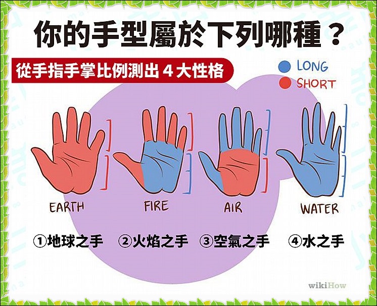 今天要來分享一個國外網站 theunknownbutnothidden 上很紅的手相測驗,藍色是較長、紅色是較短,依照手指和手掌的比例來看自己較符合哪種手掌類型,現在一起來看看你的手掌會是哪一種類型吧!